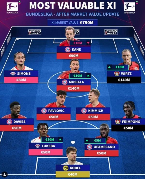12月20日訊 《轉會(huì )市場(chǎng)》今日更新了德甲球員身價(jià),并列出了一套德甲最貴陣,拜仁6將在列,萊比錫、藥廠(chǎng)各2人。